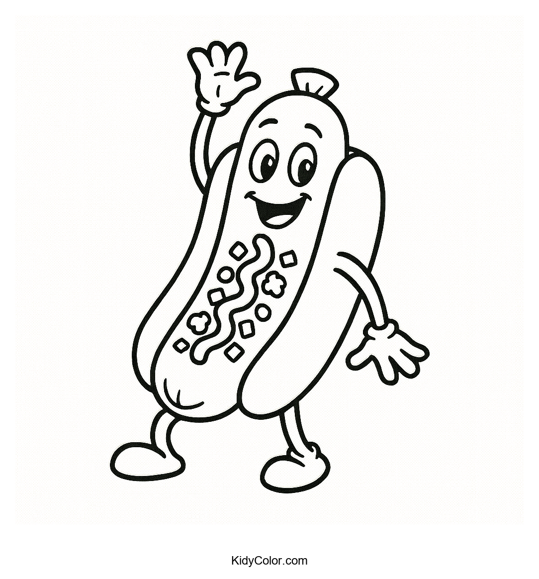 Delight your child's creativity with this cheerful anthropomorphic hot dog waving warmly! Perfect for sparking imagination and giggles, this coloring page offers a fun and quirky character to bring to life with vibrant colors.