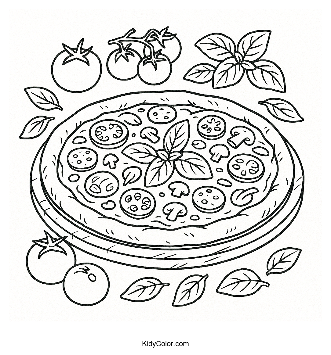 Ignite your child's creativity with this fun pizza coloring page! Featuring a delicious slice complete with fresh toppings and basil, this page invites young chefs to add their colorful touch and explore their love for cooking and art.