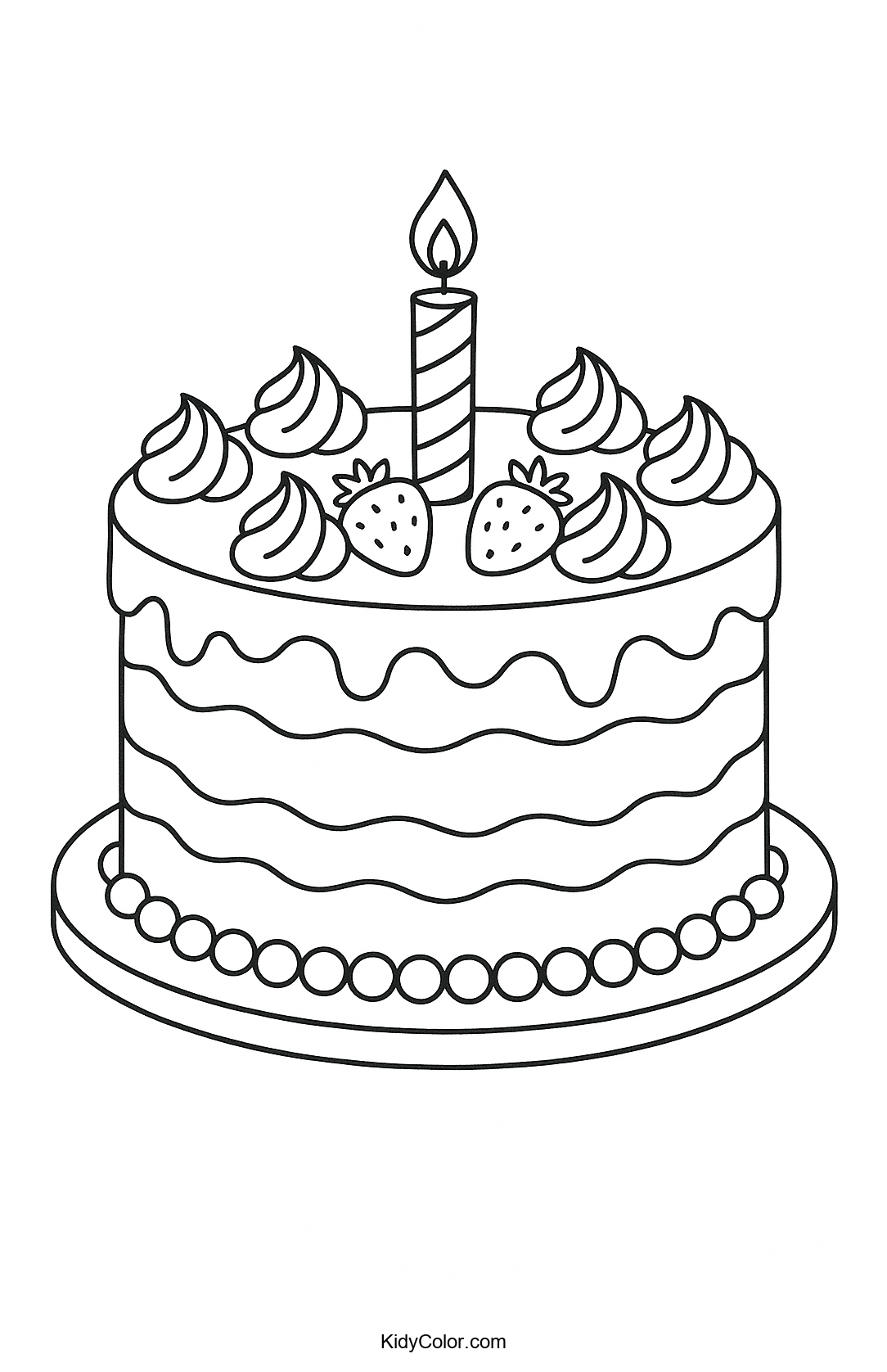 Delight your child's creativity with this cheerful birthday cake coloring page featuring a candle and strawberries. Perfect for engaging young artists and celebrating special occasions through coloring.