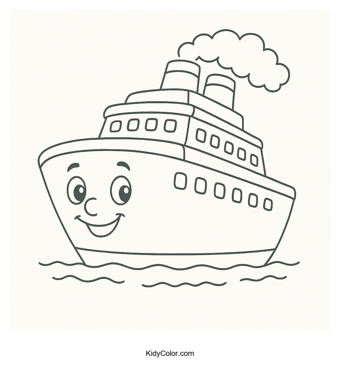 Delight your child's imagination with this fun Smiling Cruise Ship coloring page, featuring a cheerful ship setting sail on calm waters. Perfect for young artists who love the ocean and creative coloring activities.