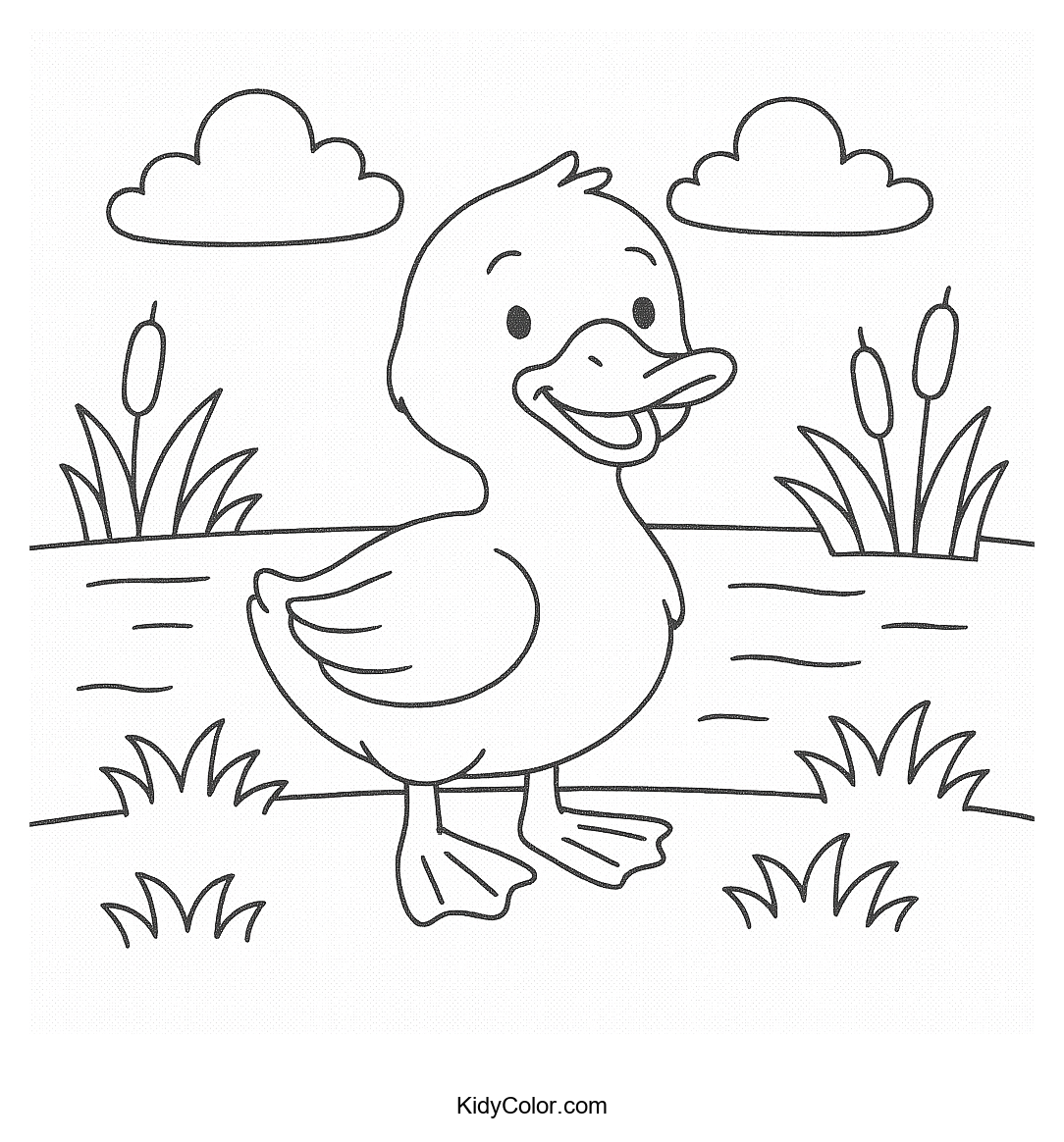 Delight your child with this adorable cartoon duck by the pond coloring page. Watch their creativity soar as they bring this playful scene to life with bright colors and imagination.