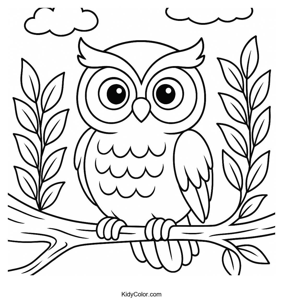 Delight your child with this charming owl perched on a branch surrounded by fluffy clouds. Perfect for sparking creativity and providing hours of coloring fun, this page is ideal for young nature enthusiasts and animal lovers.