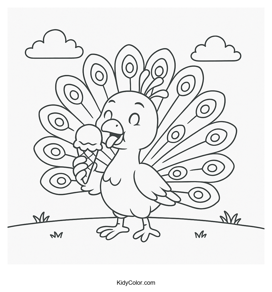 Discover the joy of coloring with a fun scene featuring a colorful peacock enjoying ice cream in the great outdoors. Perfect for children to explore colors and spark creativity with their favorite art supplies.