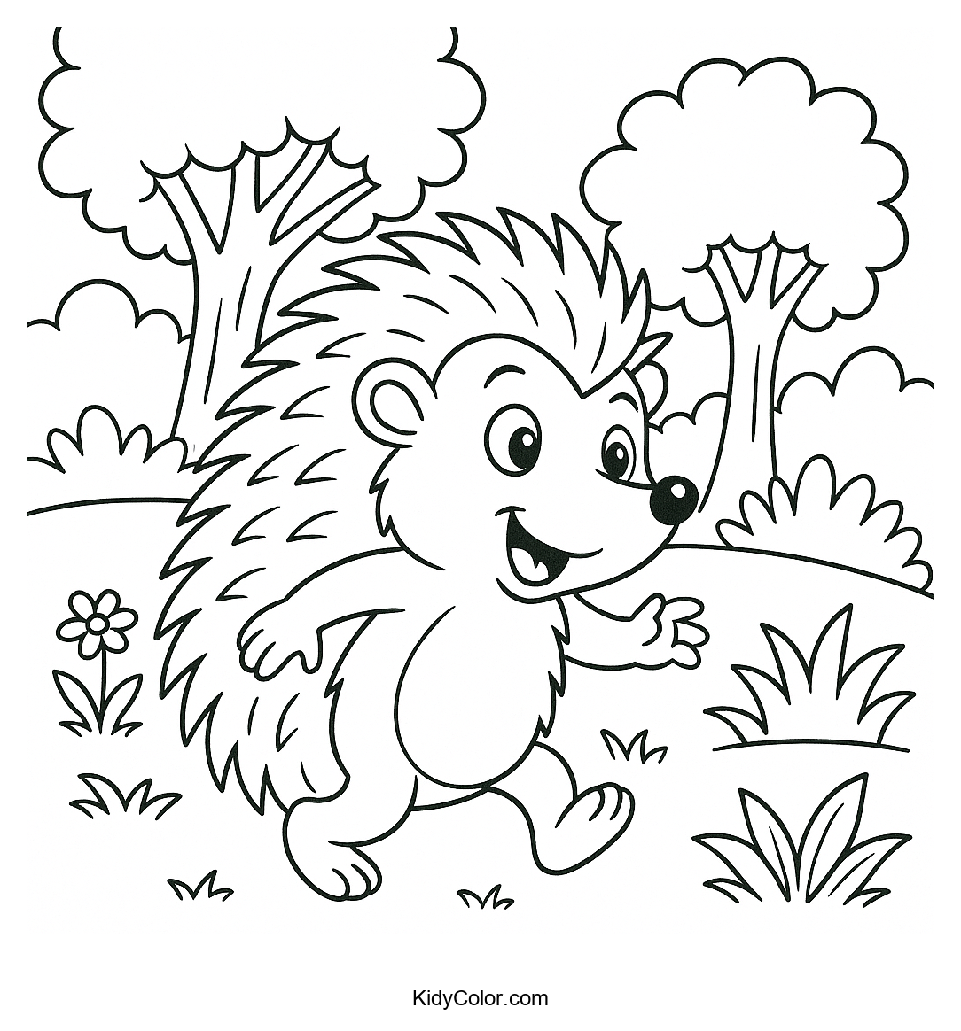 Delight your child with this charming coloring page featuring a cheerful hedgehog in the forest. Kids will love adding vibrant colors to the leaves, trees, and the happy hedgehog, sparking creativity and fun.
