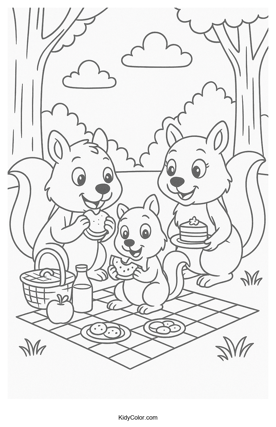 Discover the joy of coloring with our delightful squirrel picnic scene set in a whimsical forest. Perfect for sparking creativity, this coloring page invites kids to explore nature and express themselves artistically through vibrant colors.
