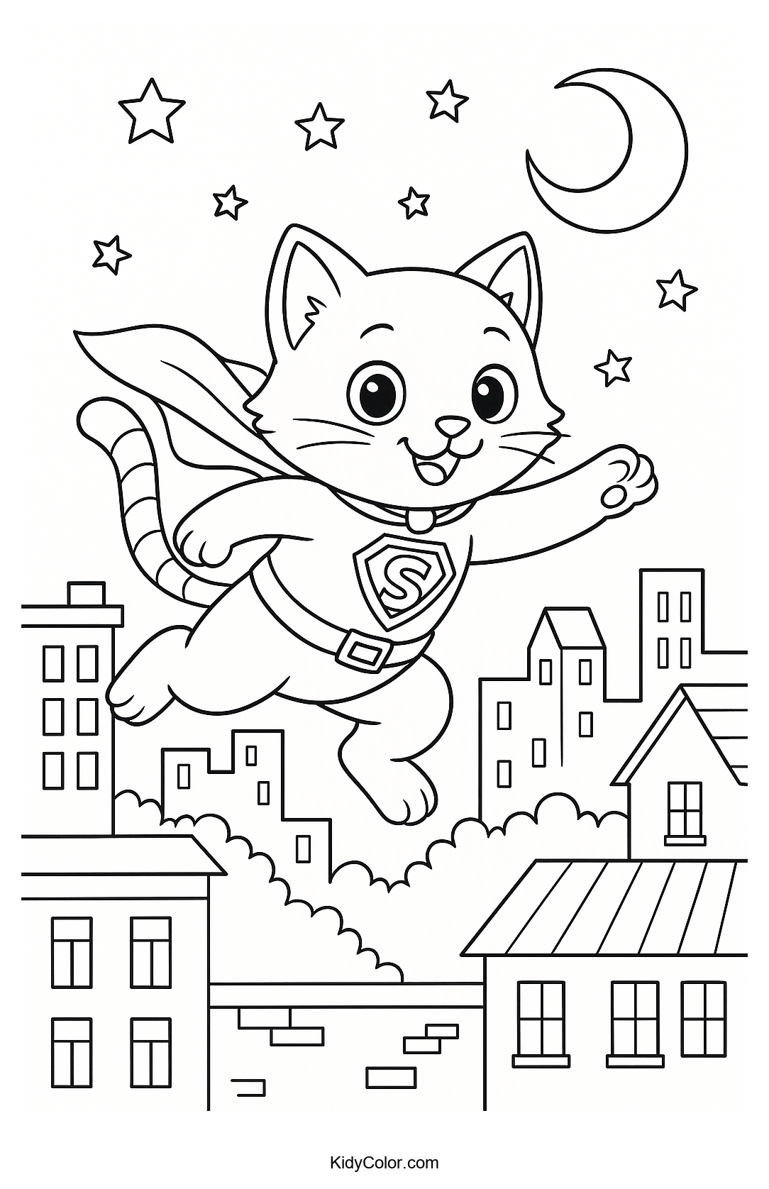 Explore creativity with our Leaping Supercat Under the Moon coloring page! Kids will love adding colors to this adventurous superhero cat soaring across the night sky, perfect for imaginative play and fine motor skills development.