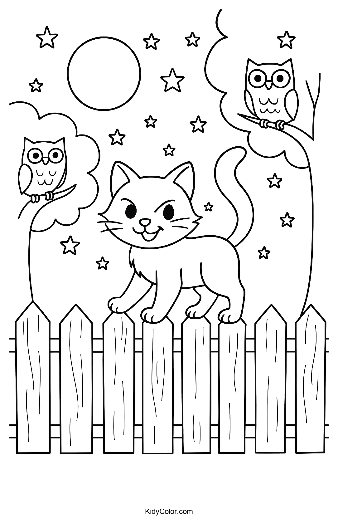 Delight your child's artistic side with this charming coloring page featuring a playful cat perched on a moonlit fence. Perfect for inspiring creativity, kids will love adding their favorite colors to this whimsical nighttime scene.