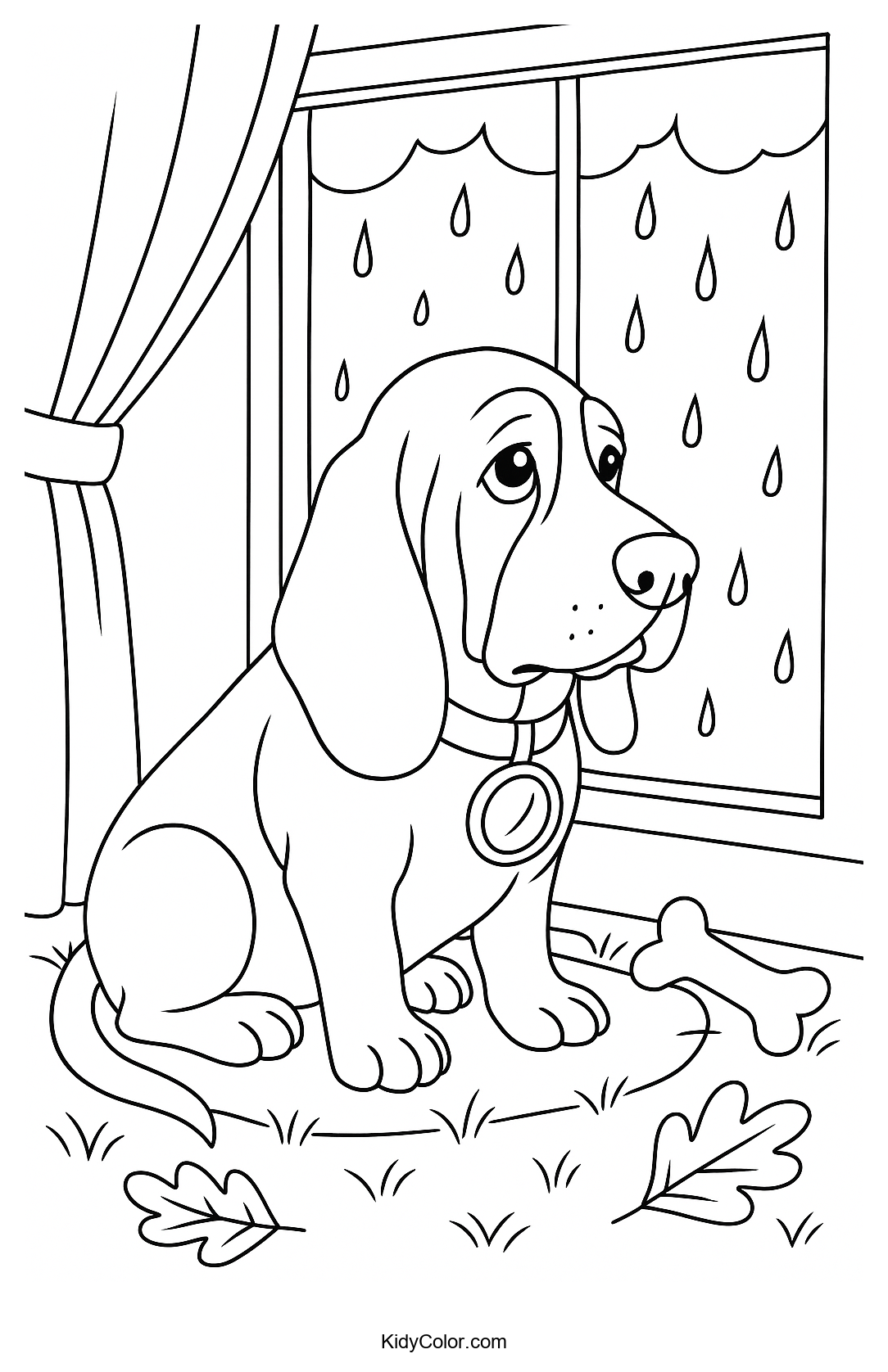 Delight your child with this adorable Basset Hound coloring page featuring a charming hound watching the rain. Kids will love bringing this sweet scene to life with their favorite colors!