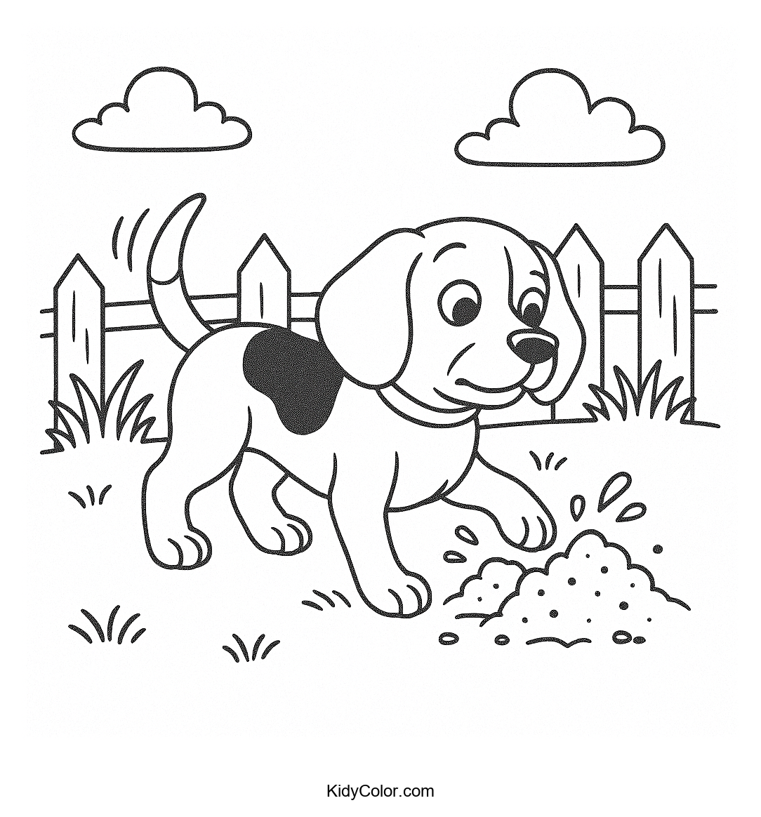 This charming coloring page features a playful Beagle enjoying a fun digging adventure in the garden. Perfect for young animal lovers, this page encourages creativity and offers an engaging coloring experience.