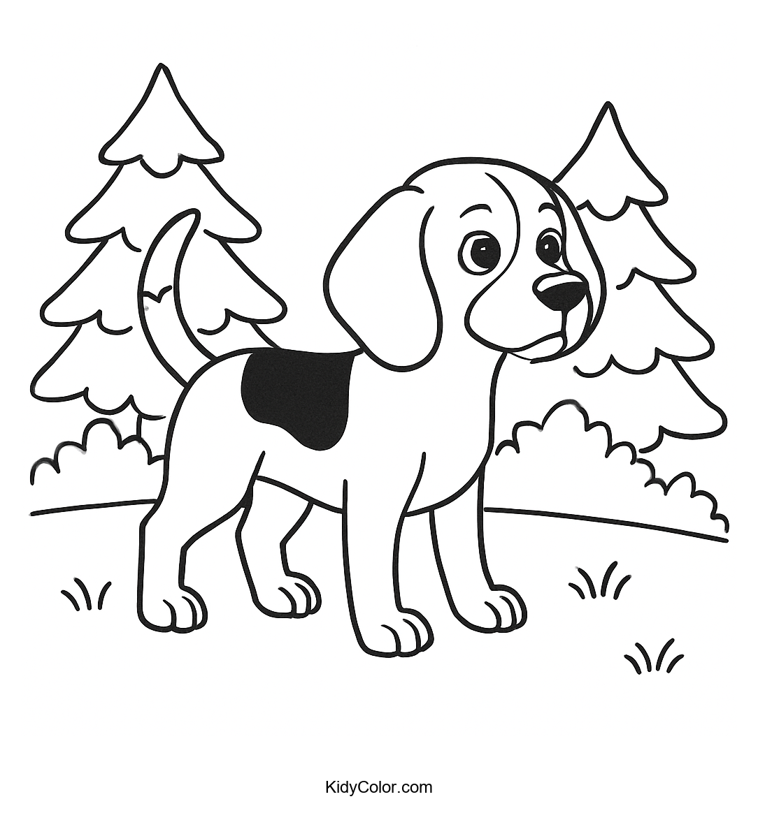 Delight your child's creativity with this adorable Beagle in a forest clearing coloring page. Perfect for young nature lovers, this page encourages kids to use their imagination while coloring a playful Beagle surrounded by lush trees and vibrant scenery.