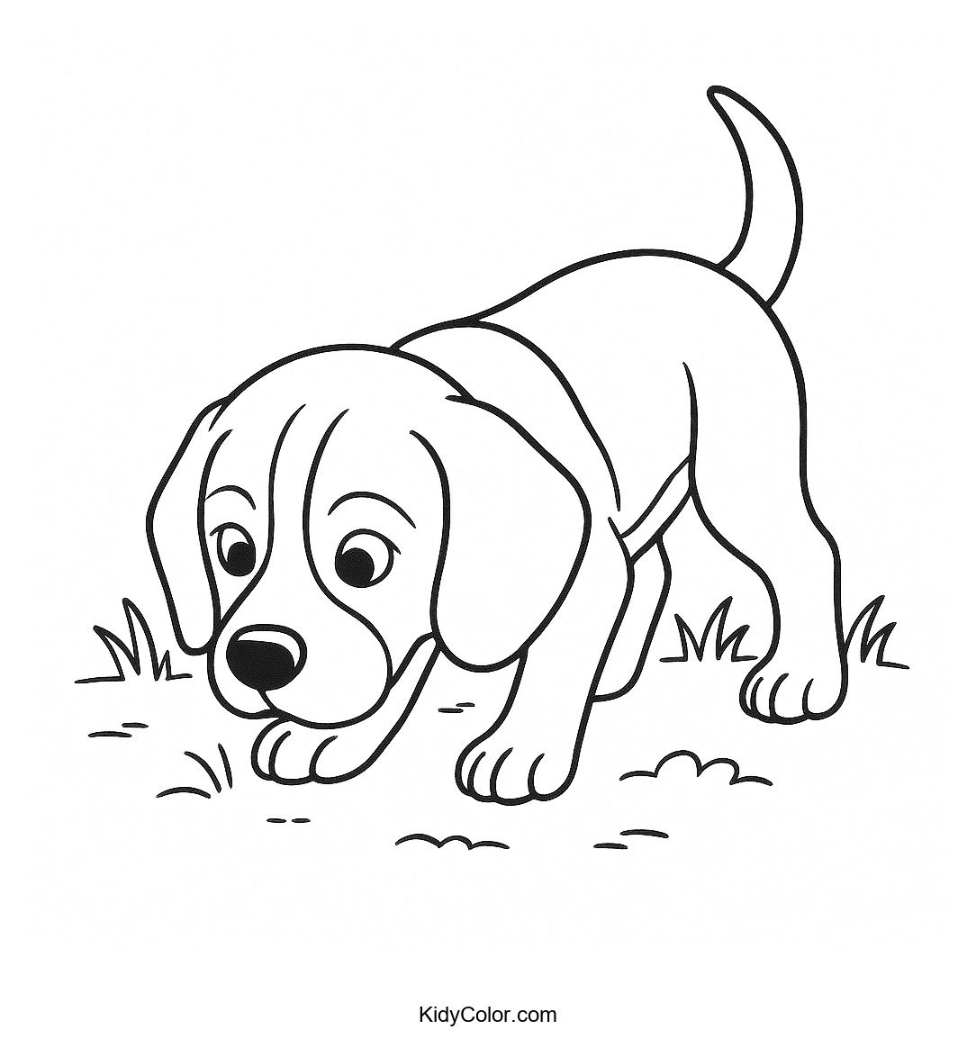 Explore the world of this adorable Beagle puppy as it sniffs the ground, perfect for young dog lovers to color. This delightful scene encourages creativity and brings joy to kids while they imagine life's adventures through a puppy's eyes.