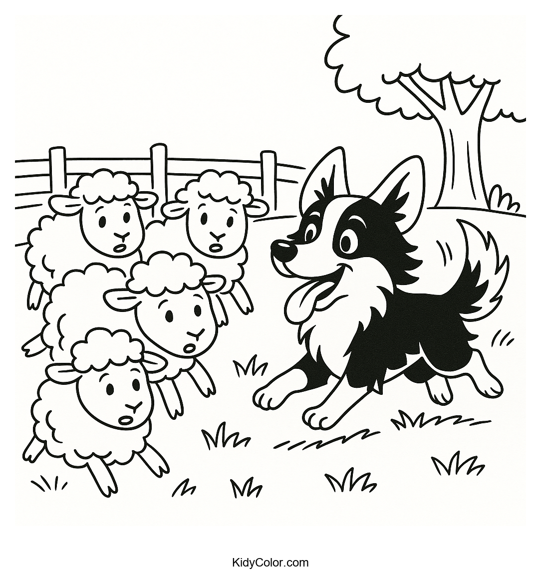 Delight your child with this charming coloring page featuring a Border Collie herding sheep in a lush pasture. This engaging scene invites young artists to explore colors while learning about farm life and the important role of sheepdogs.