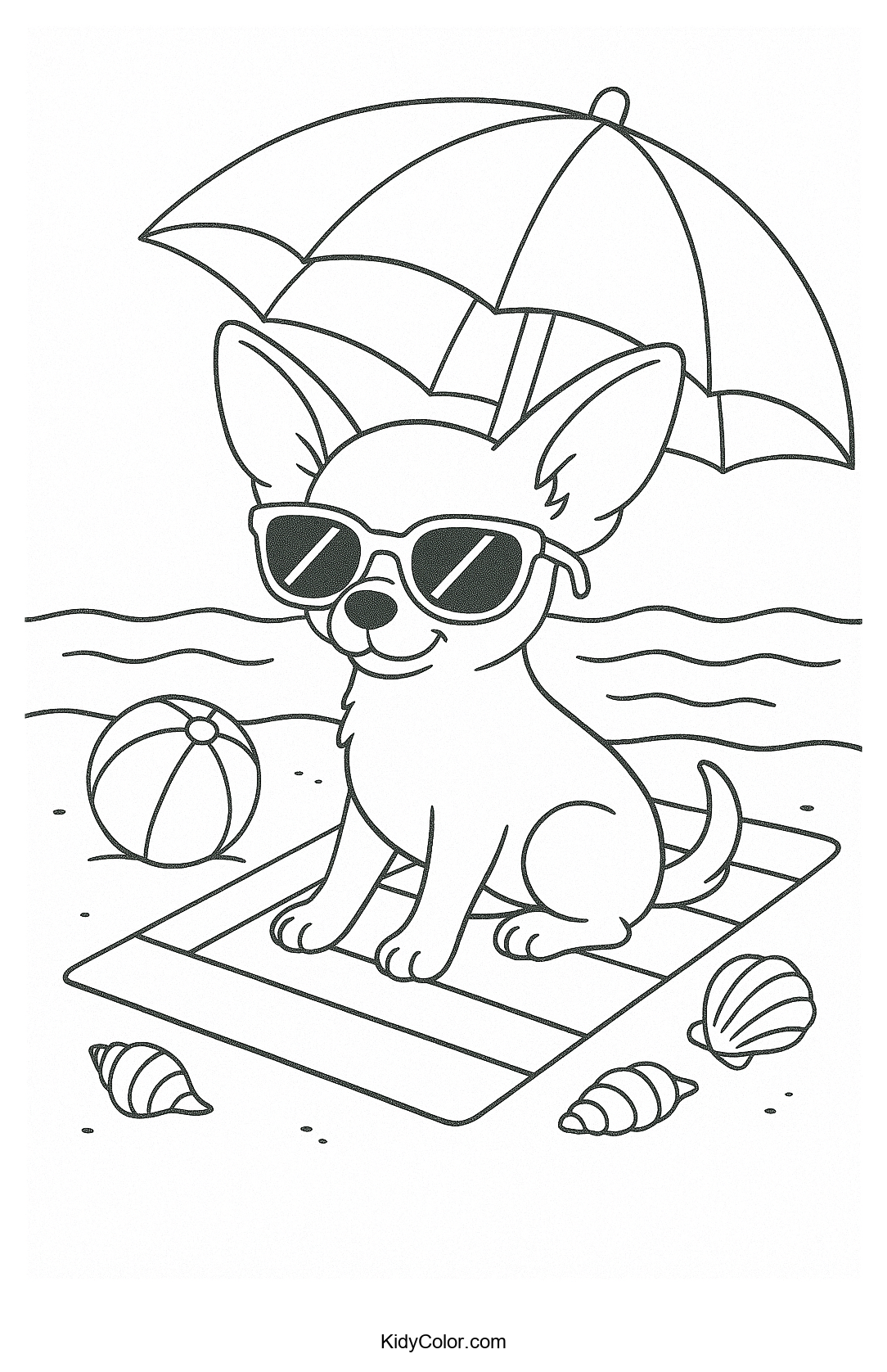 Discover this adorable Chihuahua basking in the sun on its cozy beach towel. Perfect for young artists, this coloring page lets kids imagine a playful day at the beach while enhancing their coloring skills.