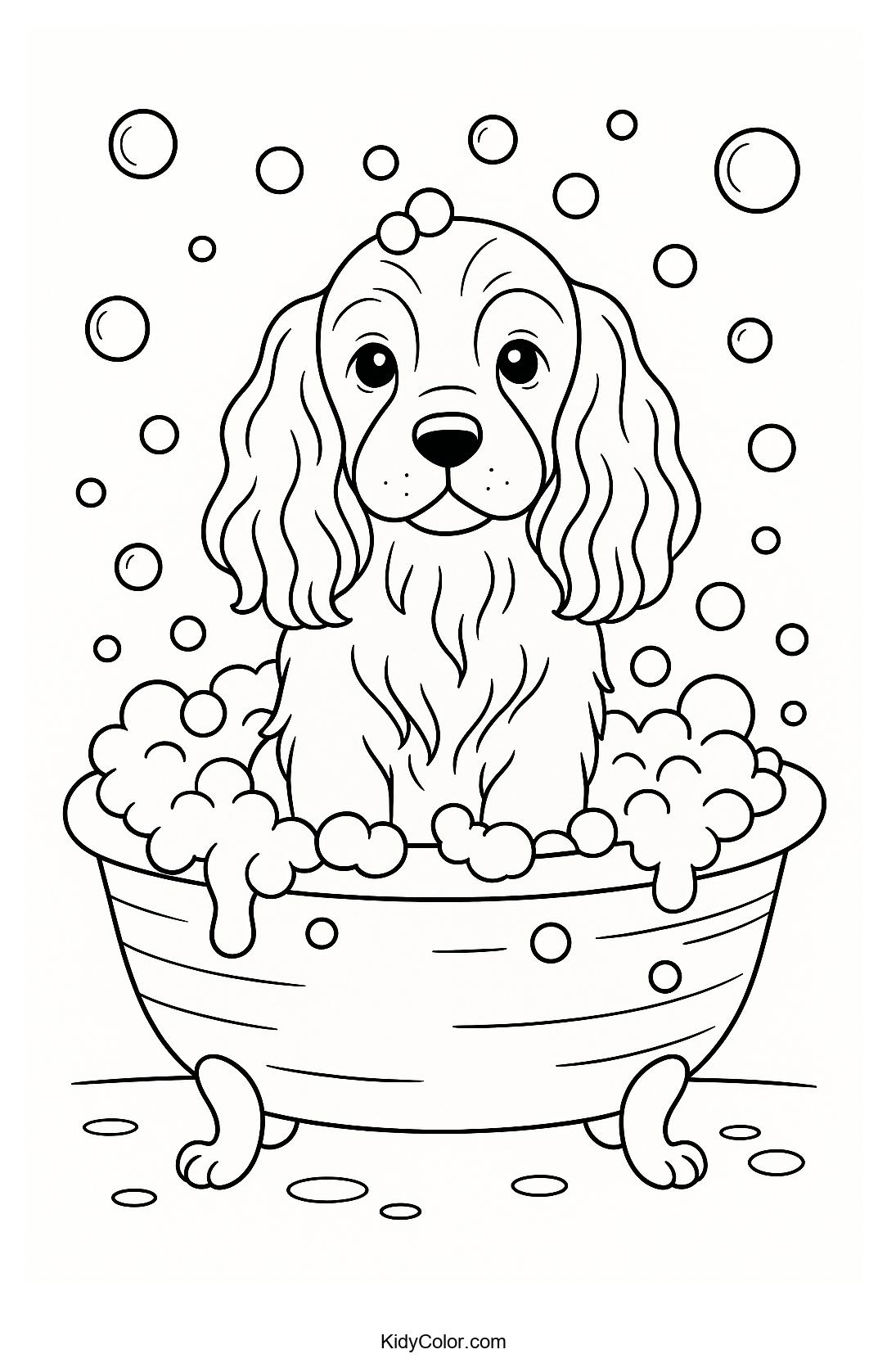 Delight your little artist with this adorable coloring page featuring a cute Cocker Spaniel enjoying a bubble bath! Perfect for kids who love dogs and playful scenes, this page offers a fun and relaxing coloring experience.