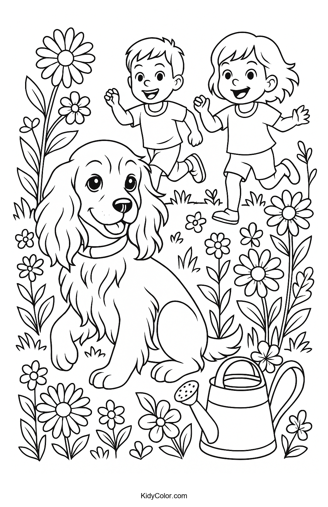 Delight your child's creativity with this charming coloring page featuring joyful children playing amidst a vibrant garden scene. Perfect for hours of colorful fun, this printable encourages imagination and fine motor skills as kids bring the outdoor playtime to life.