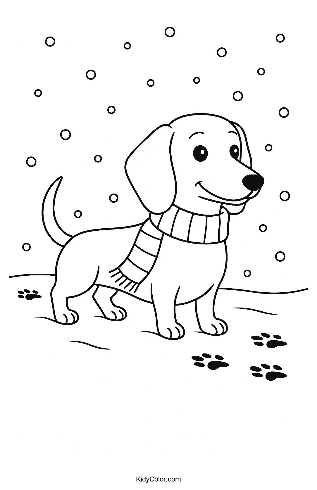 Delight your kids with this adorable Dachshund exploring a winter wonderland. Perfect for sparking creativity and enhancing fine motor skills, this coloring page offers a fun way to learn about winter scenes and playful pets.