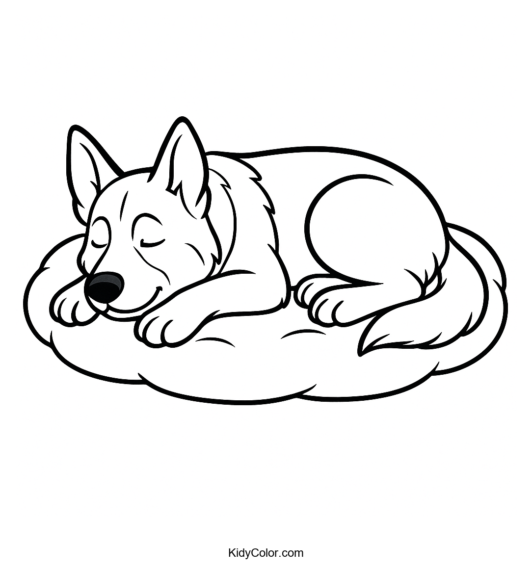 Discover a delightful coloring page featuring a peaceful German Shepherd snoozing comfortably on a bed. Perfect for young dog lovers, this coloring page allows kids to explore their creativity while coloring a calm and cozy scene.