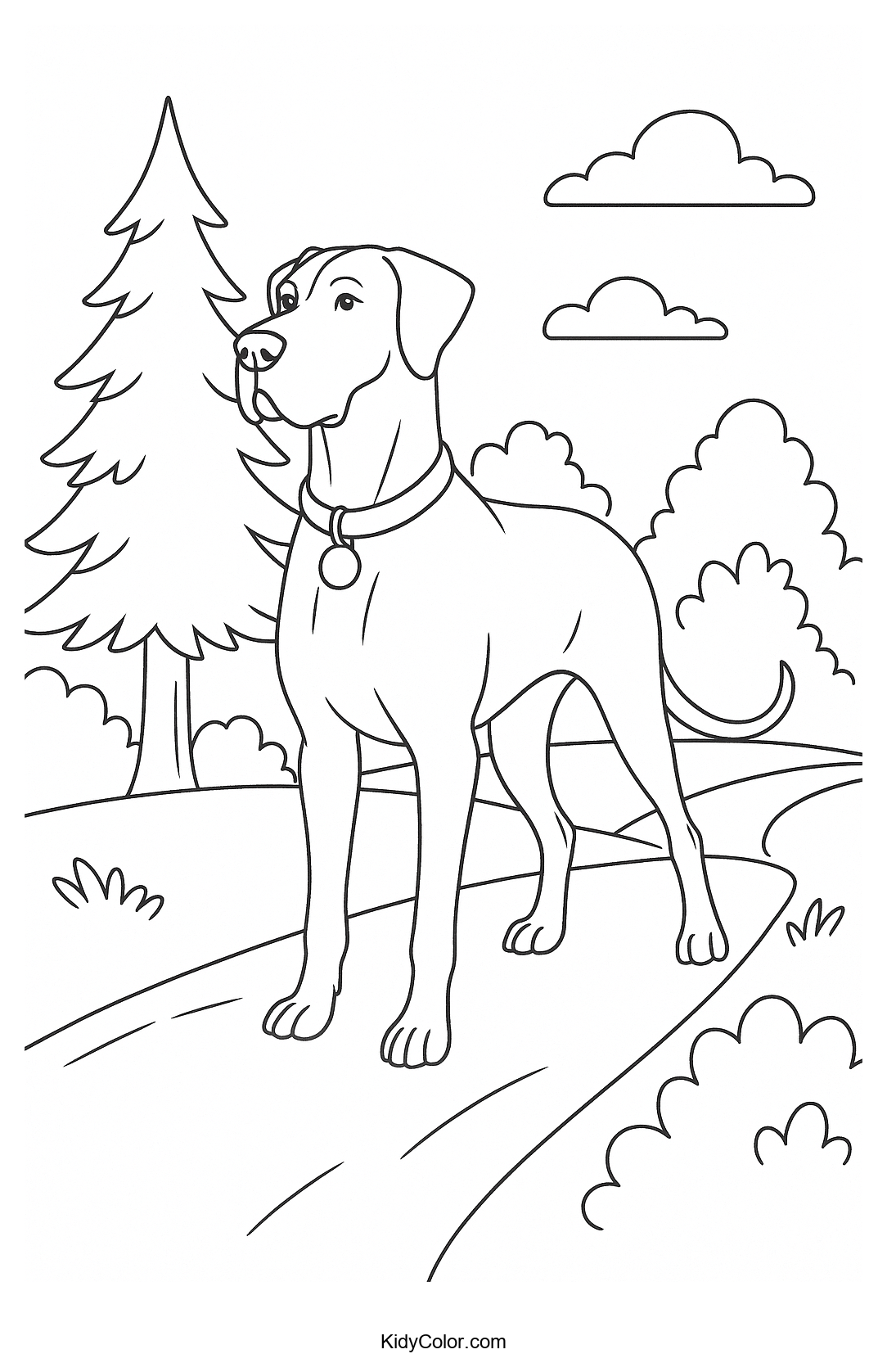 Explore the beauty of nature with this Great Dane in Scenic Landscape coloring page. Children will love coloring this majestic dog amid mountains and trees, sparking creativity and a love for animals and the outdoors.