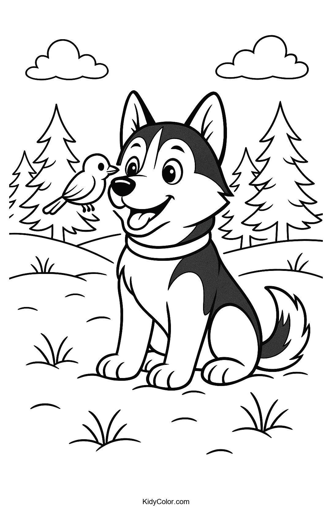 Delight your child with this adorable coloring page featuring a playful husky and a chirpy bird in a serene snowy meadow. Perfect for fostering creativity, this page combines a love for animals and winter fun in an easily printable format.