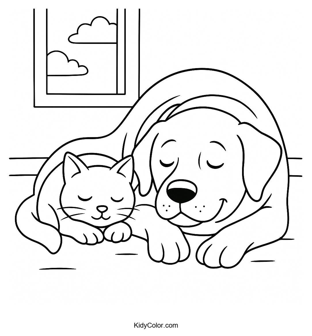 Delight your child with this adorable coloring page featuring a cozy dog and cat snoozing side-by-side. Perfect for young animal lovers to color and express their creativity while enjoying the heartwarming friendship of these furry pals.