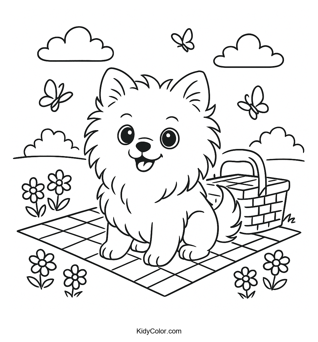 Delight your child's creativity with this cute puppy enjoying a sunny day on a picnic blanket in the park. This delightful coloring page sparks imagination and provides hours of coloring fun.