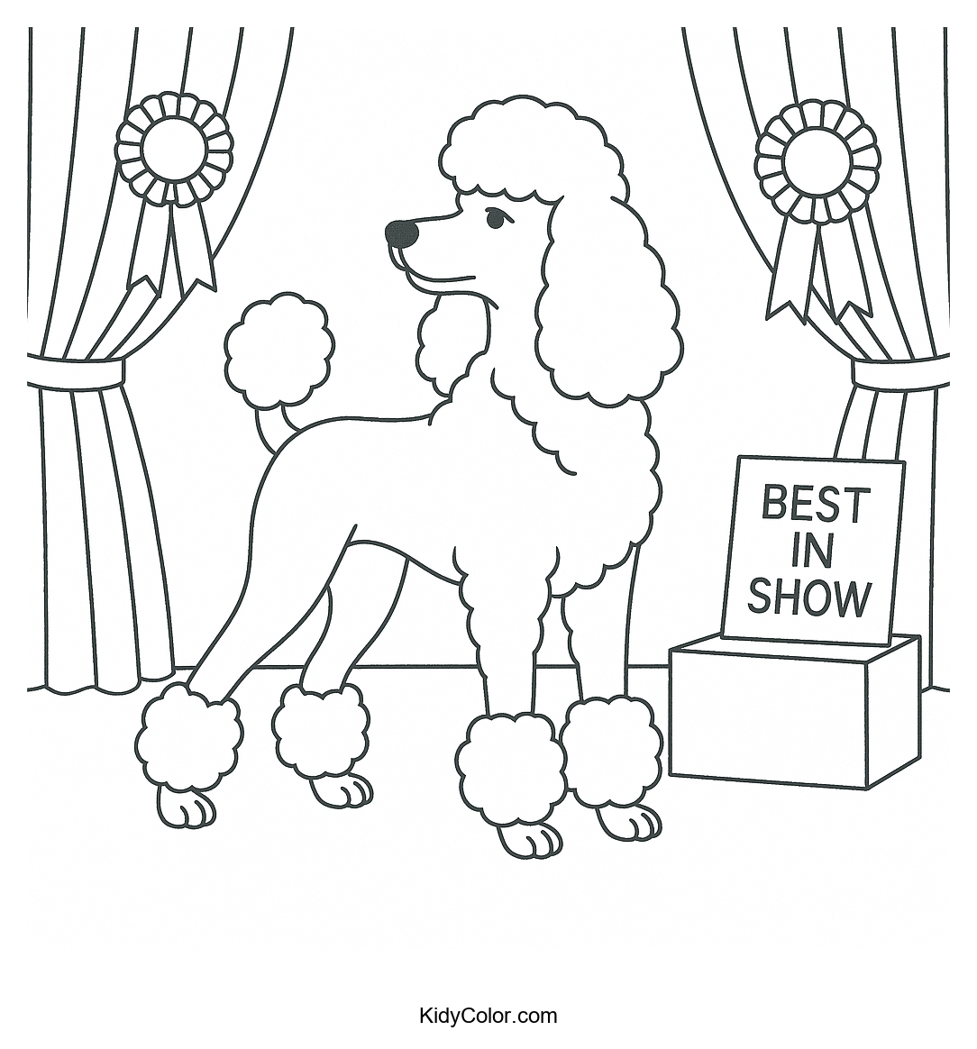 Delight in coloring this elegant 'Best in Show' poodle, perfect for kids who love dogs and enjoy creative activities. This detailed illustration offers an opportunity to bring out the poodle's charm and flair, providing hours of coloring fun.