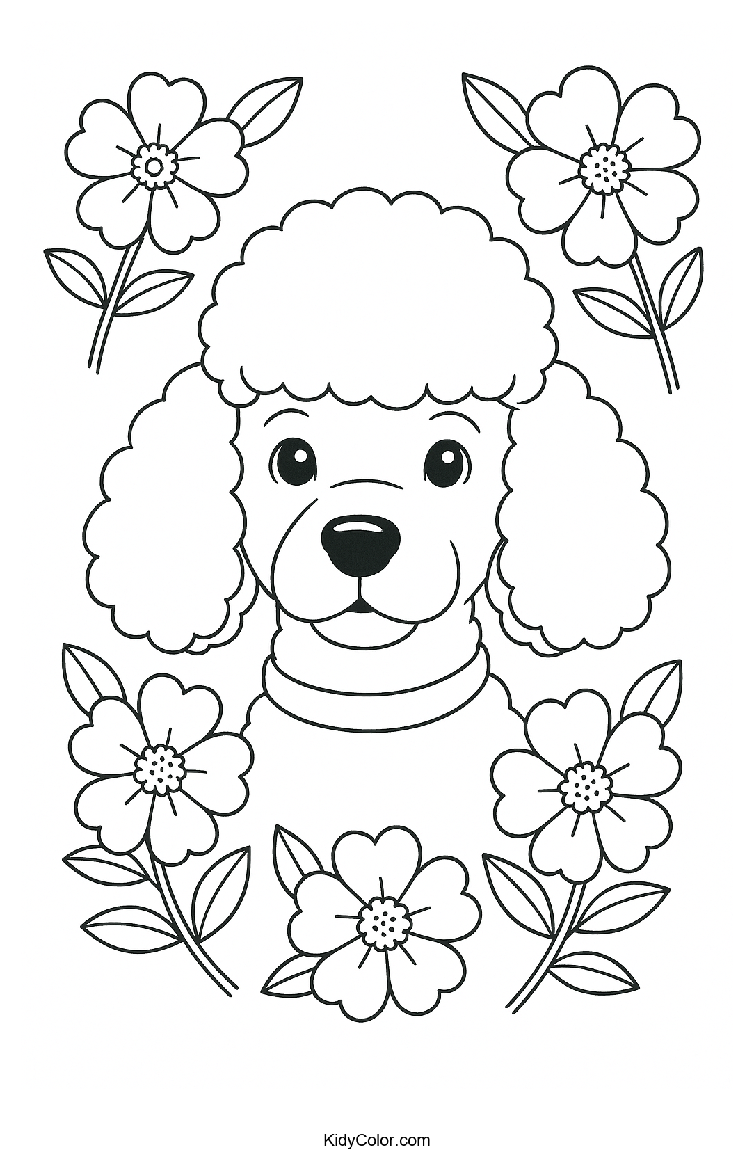 Delight your child with this intricate coloring page featuring a playful poodle surrounded by beautiful flowers. Perfect for young artists to explore creativity and color in a captivating floral scene.