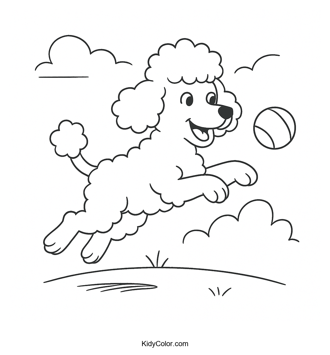 Engage your child with this delightful coloring page of a lively poodle playfully leaping for a ball. Perfect for young animal lovers, this scene encourages creativity while they add their favorite colors to the joyful pet adventure.
