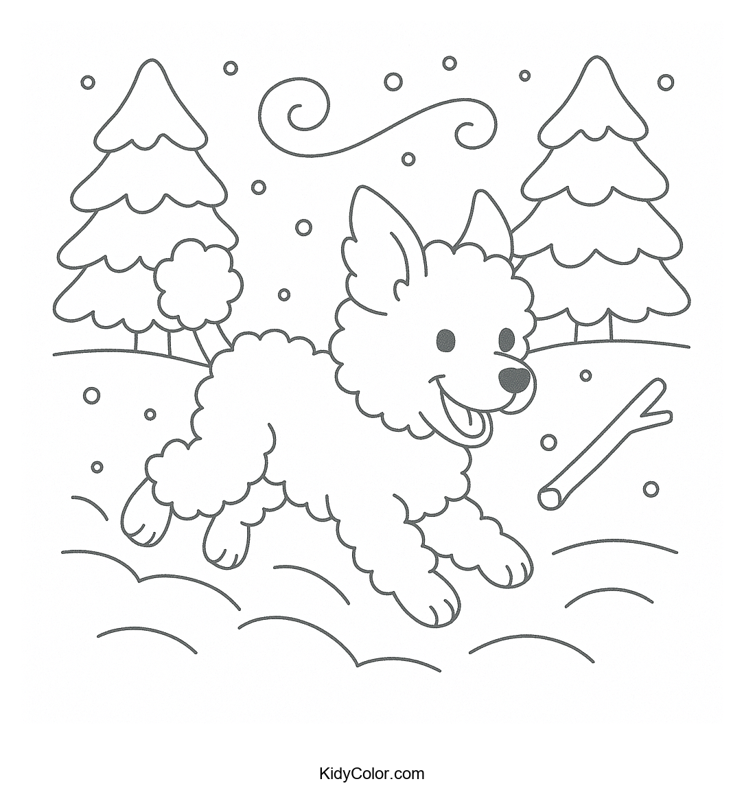 Delight your child's creativity with this charming coloring page of a playful poodle frolicking in the winter snow. Perfect for a cozy indoor activity as your little one brings this snowy scene to life with color.