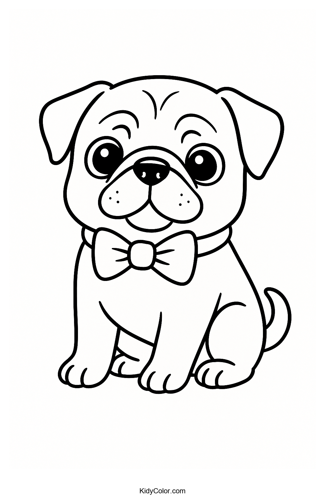 Discover this adorable coloring page featuring a charming pug puppy wearing a bowtie. Kids will love bringing this playful pup to life with their favorite colors, perfect for all little animal lovers and budding artists.