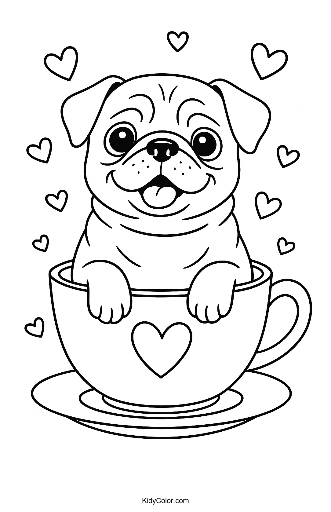 Delight your child's creativity with this adorable pug in a teacup coloring page, featuring cheerful hearts. Perfect for young animal lovers, this page combines fun and charm, encouraging imaginative coloring adventures.