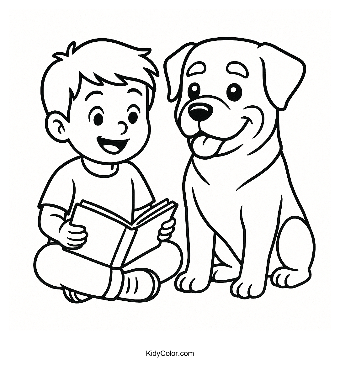 Delight your little artist with this charming coloring page featuring a boy and his loyal dog engrossed in a storybook adventure. Perfect for encouraging creativity and storytelling, this scene will inspire kids to bring it to life with their favorite colors.