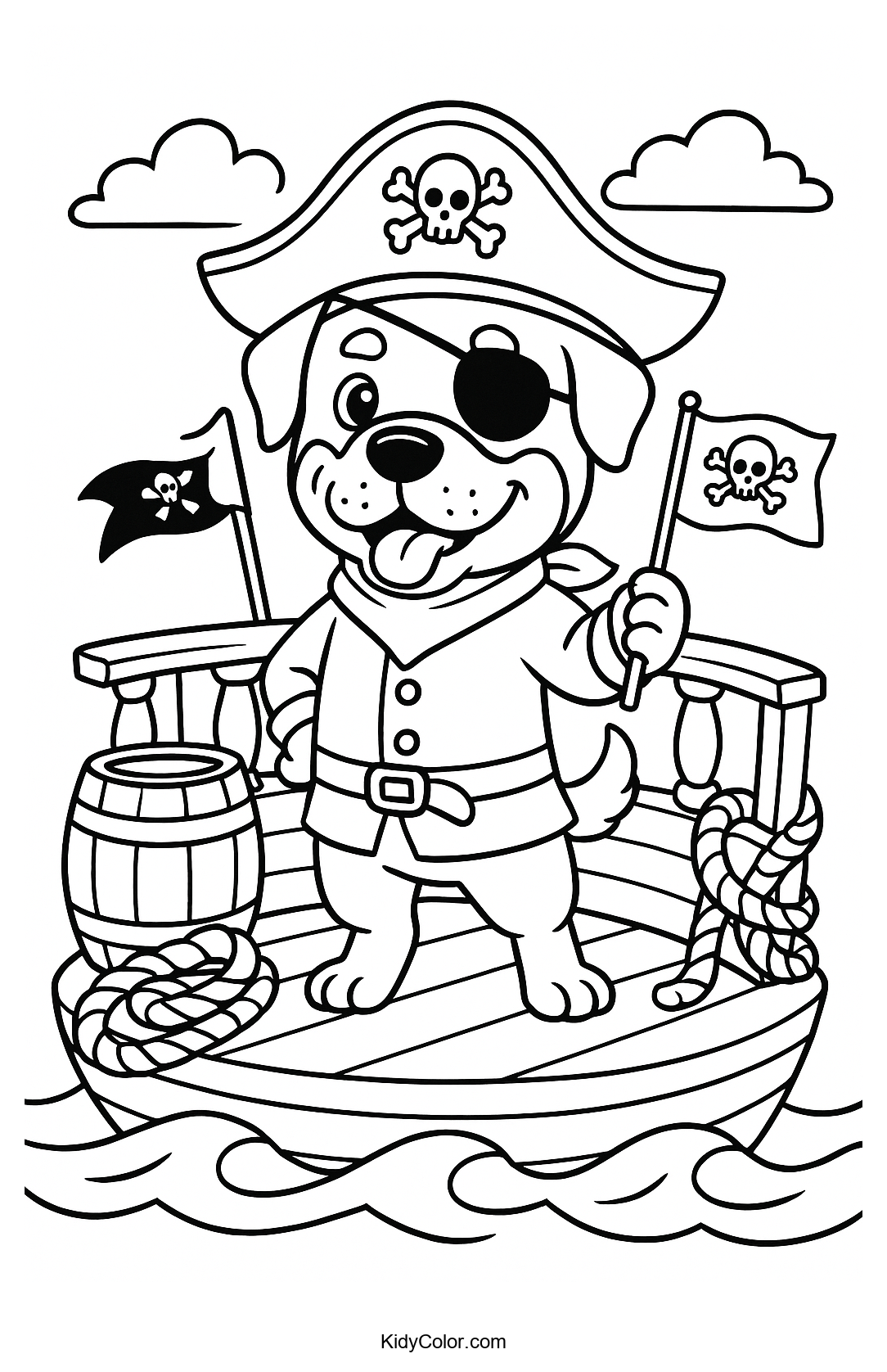 Set sail with this adventurous Pirate Rottweiler coloring page! Perfect for little buccaneers, this fun scene invites kids to explore their creativity as they color the fearless pirate pup onboard his ship.