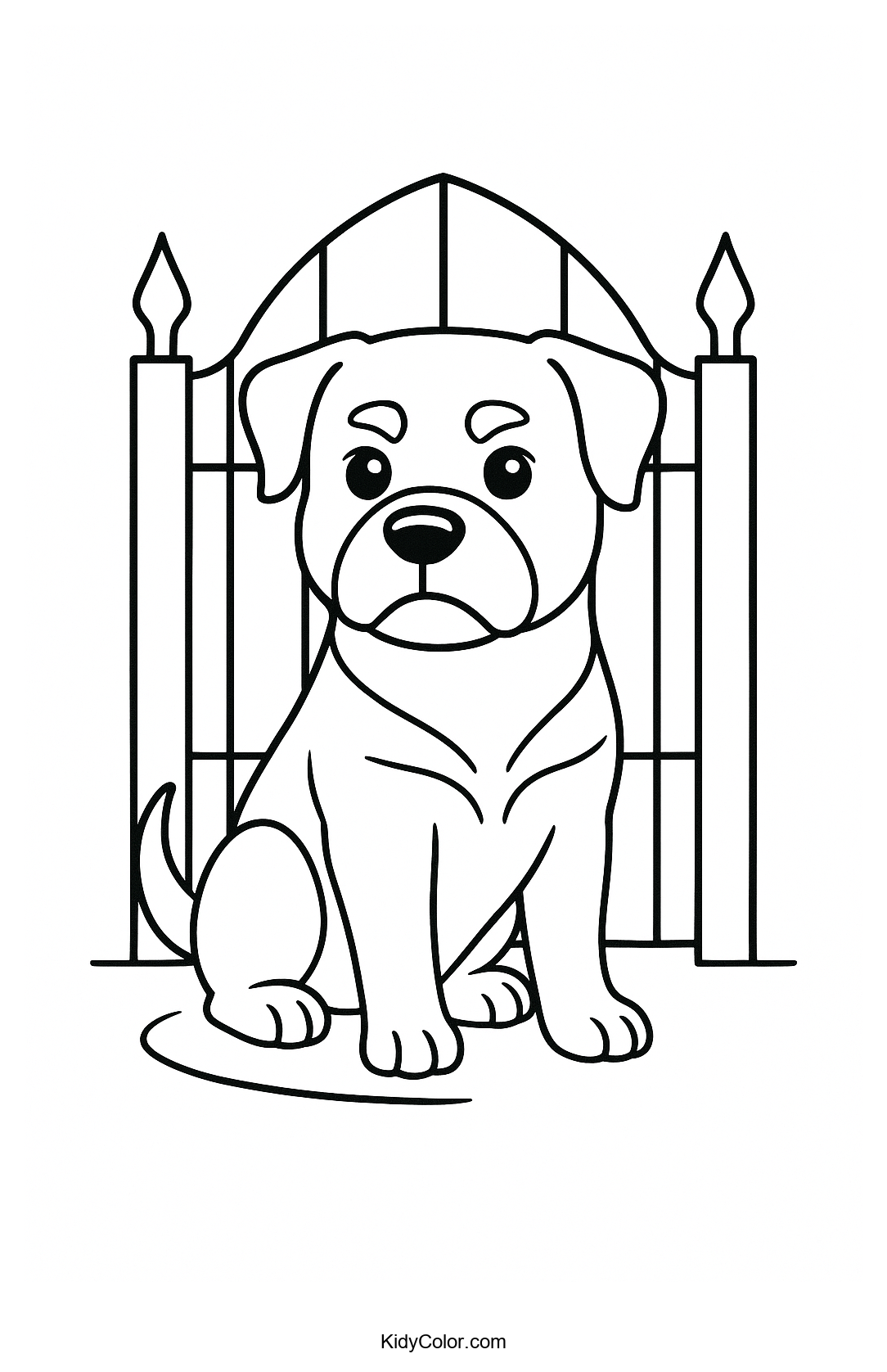 Discover this delightful coloring page featuring a Rottweiler dog standing proudly in front of a detailed wrought iron gate. This fun and engaging scene will spark creativity and provide hours of entertainment for your child as they bring this lovable canine and intricate background to life with colors.
