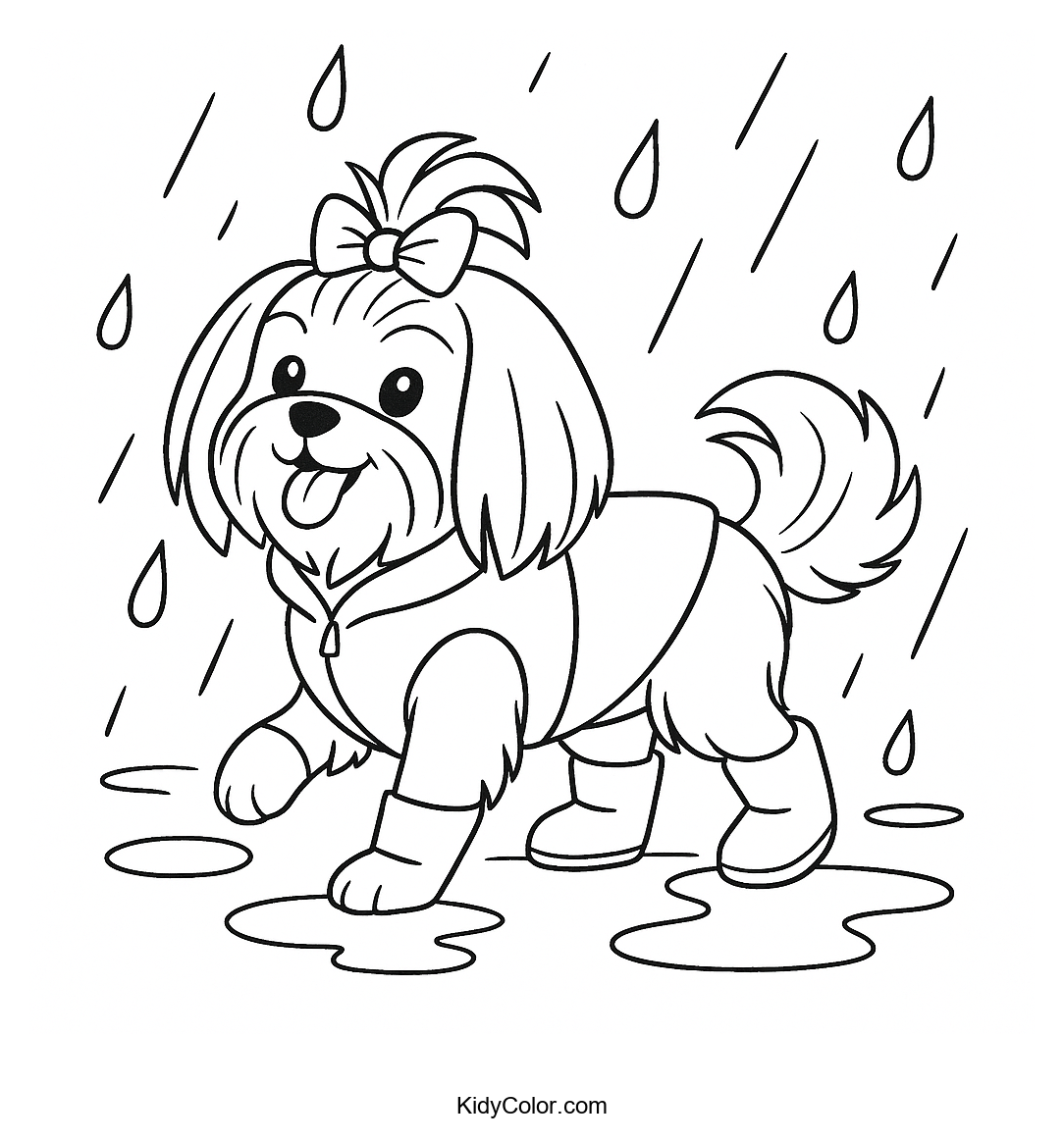 Discover the joy of coloring with our fun Shih Tzu in the Rain page! This delightful scene featuring a cheerful Shih Tzu frolicking with its umbrella in the rain is perfect for kids who love dogs and creative coloring adventures.