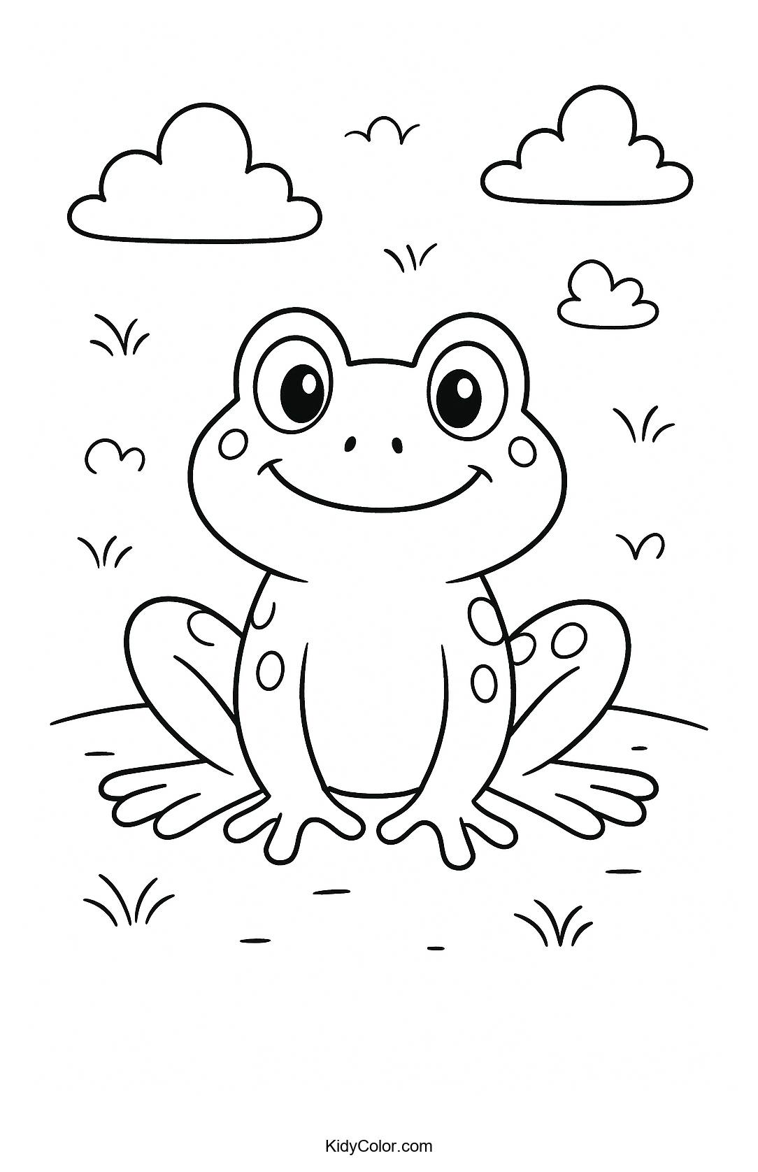 Discover a delightful coloring page featuring a cheerful frog surrounded by fluffy clouds in a vibrant field. Perfect for sparking creativity, kids will enjoy bringing this playful scene to life with colors.