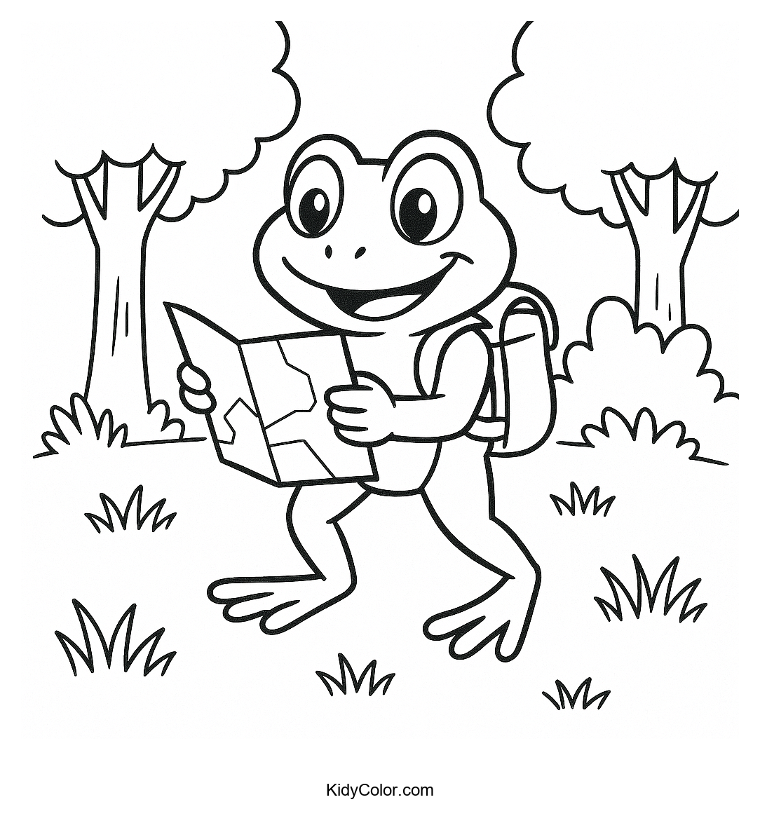 Dive into an exciting forest adventure with this Frog Adventurer coloring page! Perfect for sparking creativity, children will enjoy bringing to life the vibrant scene of a daring frog amidst lush greenery and hidden treasures.