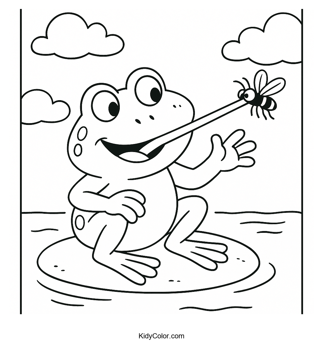 Delight your child with this fun frog coloring page, featuring a lively frog catching a fly with its long tongue. Perfect for young artists to explore colors while imagining the vibrant scenes of nature.