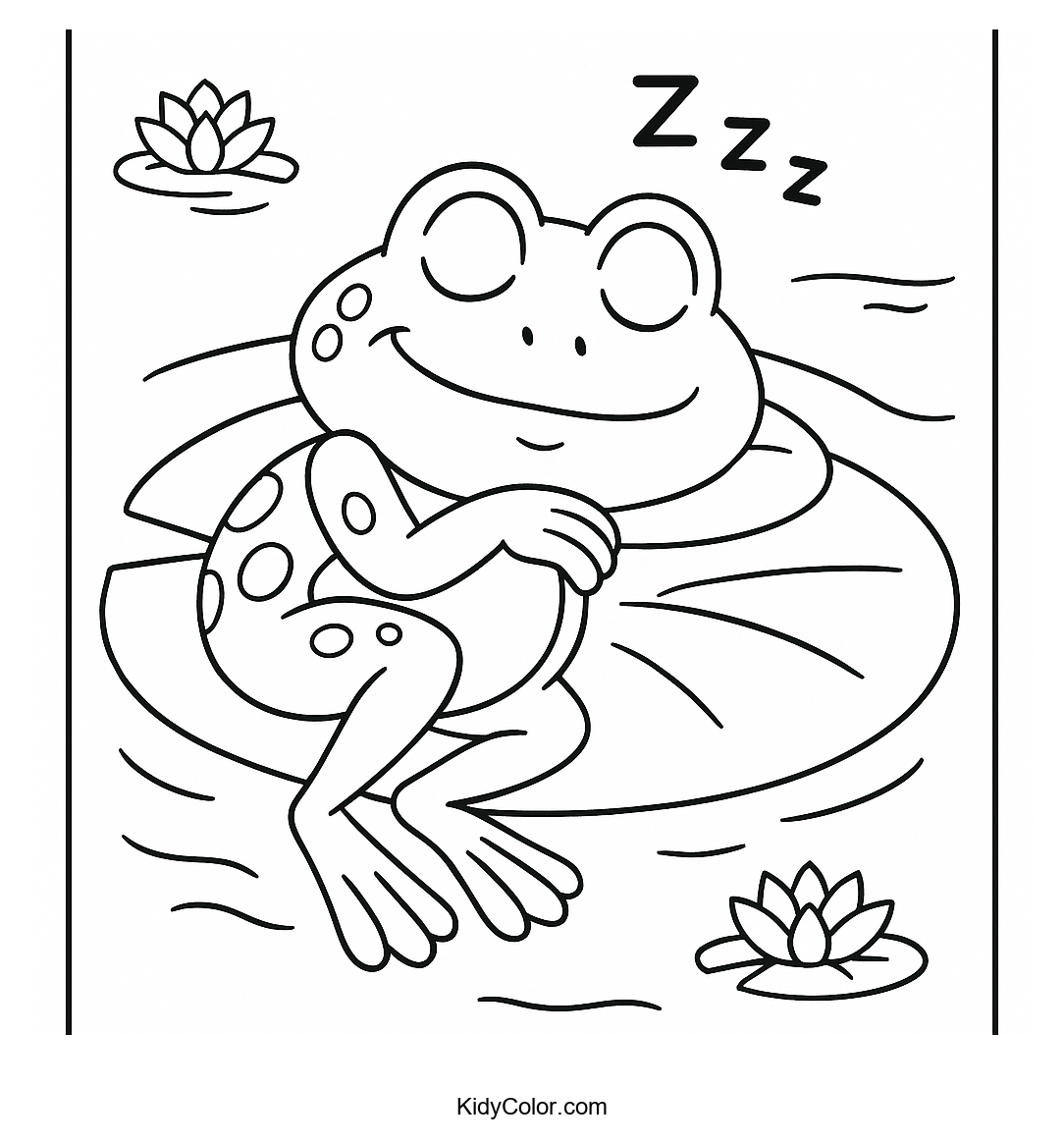 Dive into a peaceful pond scene with your kids as they color a tranquil frog dozing on a lily pad. This soothing coloring page is perfect for nurturing creativity and calming imaginations.
