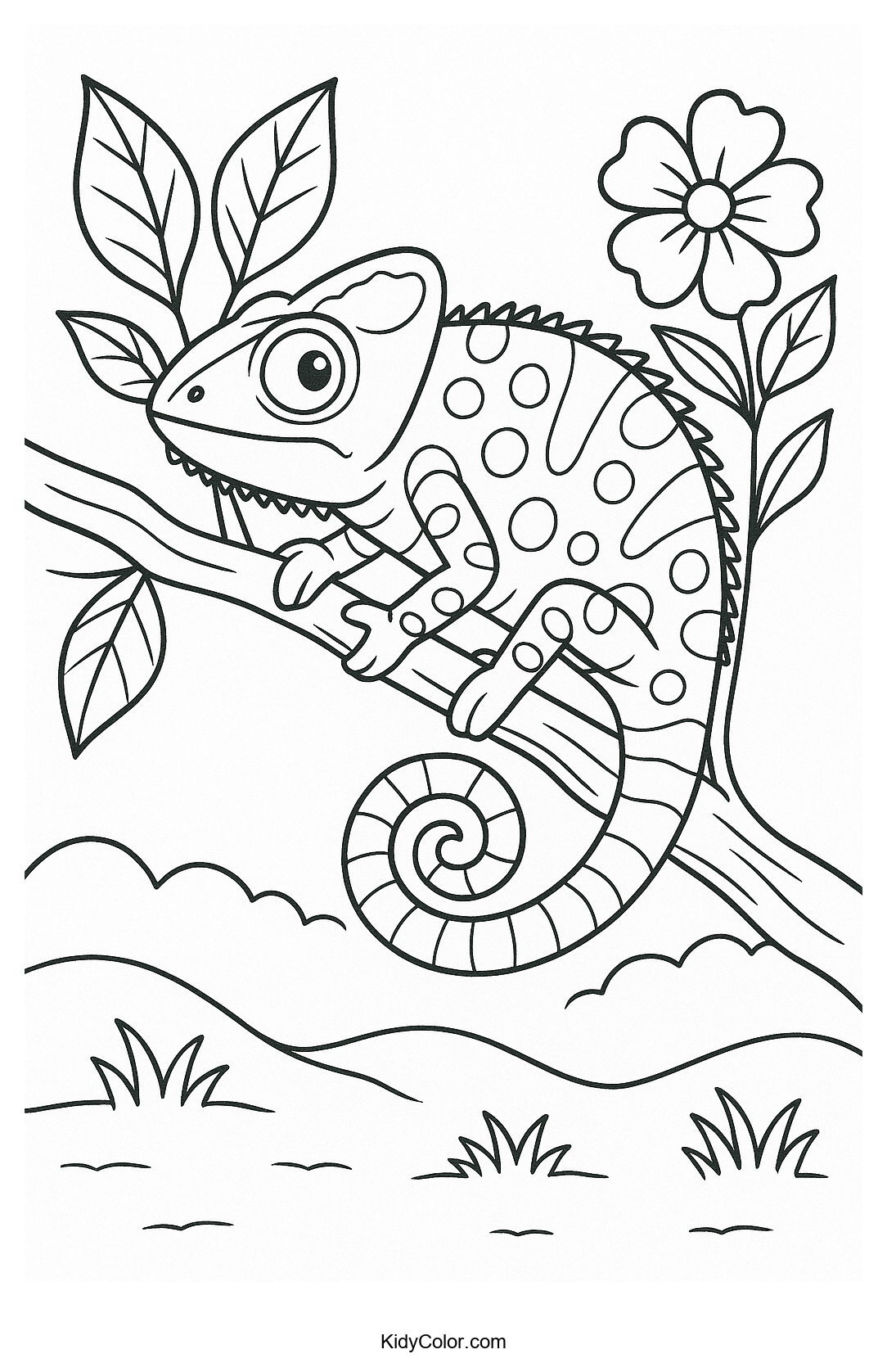 Delight your child's creativity with this engaging Chameleon on a Branch with Flowers coloring page. Perfect for kids who love nature and colorful reptiles, this scene encourages artistic expression and fine motor skill development.
