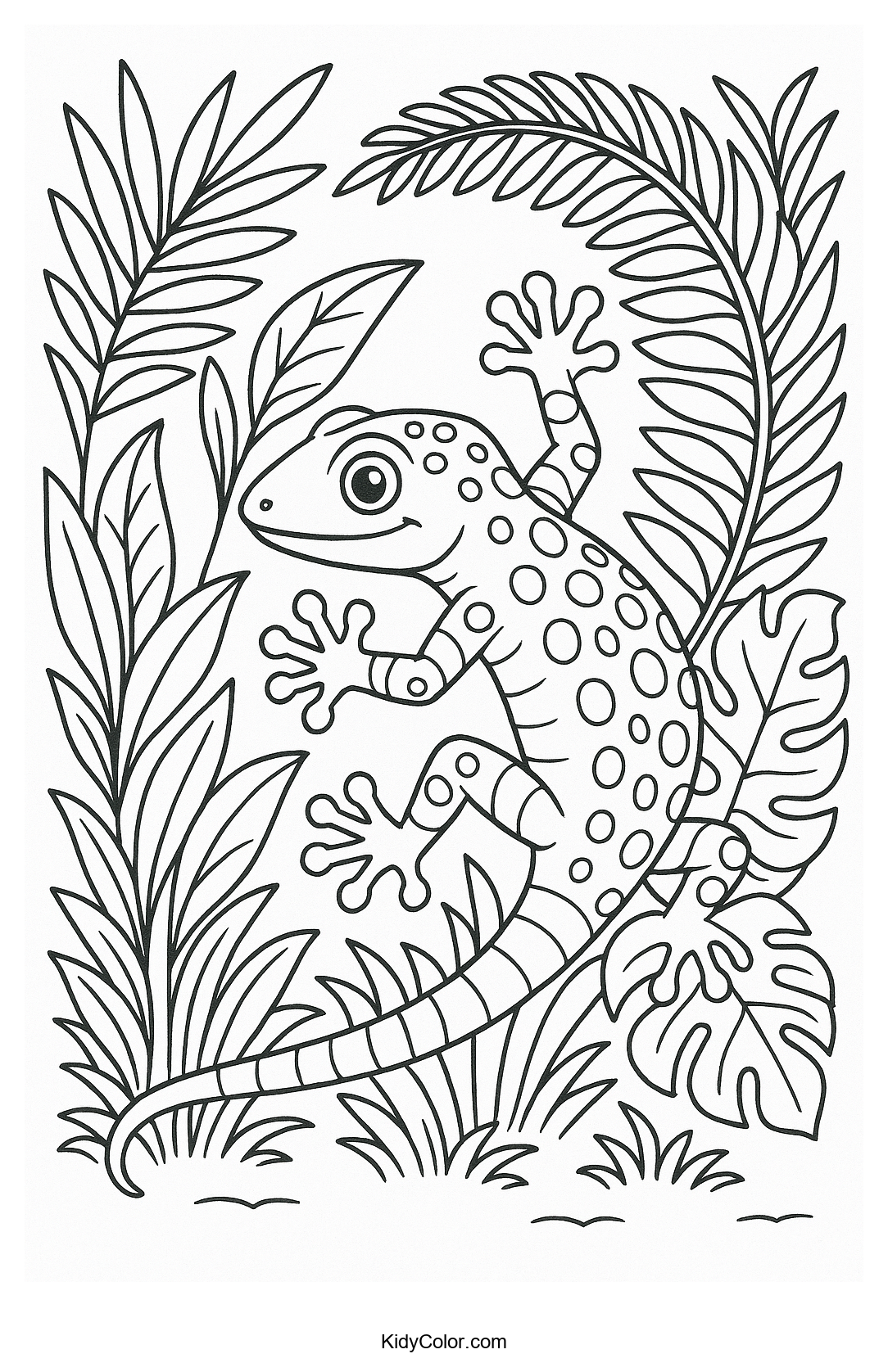 Explore nature with this fun coloring page featuring a gecko nestled among vibrant tropical foliage. Perfect for sparking creativity, kids will love adding their own splash of color to this inviting rainforest scene.
