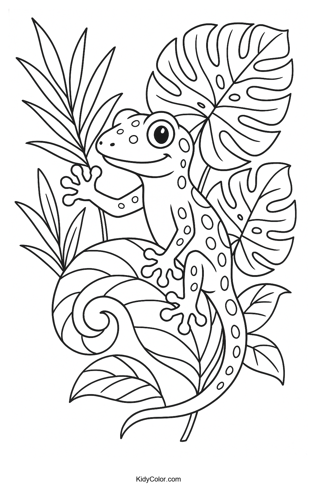 Delight your child with this fun and educational coloring page featuring a whimsical gecko perched on a curling tropical leaf. Perfect for fostering creativity, kids will love bringing vivid colors to this unique jungle scene.