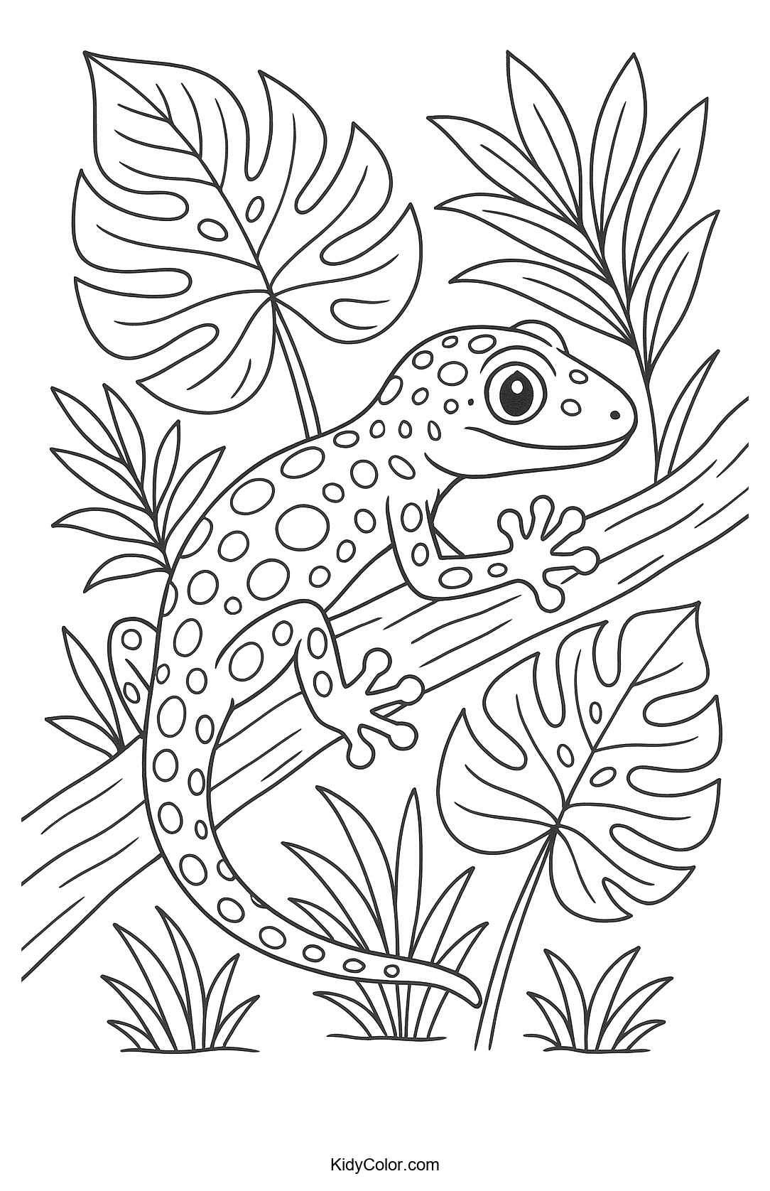 Delight your child with this fun coloring page featuring a gecko perched on a curved branch surrounded by leaves. Perfect for encouraging creativity as they bring this lively scene to vivid life with their favorite colors.