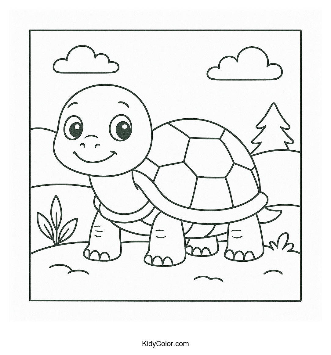 Delight your child's creativity with this adorable cartoon turtle coloring page, featuring a charming turtle in its natural habitat. Perfect for young artists, this scene encourages imaginative coloring and develops fine motor skills through fun, colorful exploration.