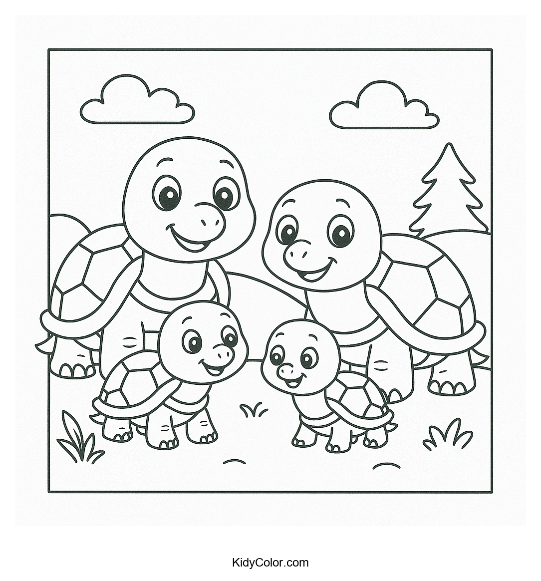 Discover the delightful turtle family nestled in nature's beauty. Perfect for coloring fun, this page offers kids the opportunity to explore creativity while learning about turtles in their natural habitat.