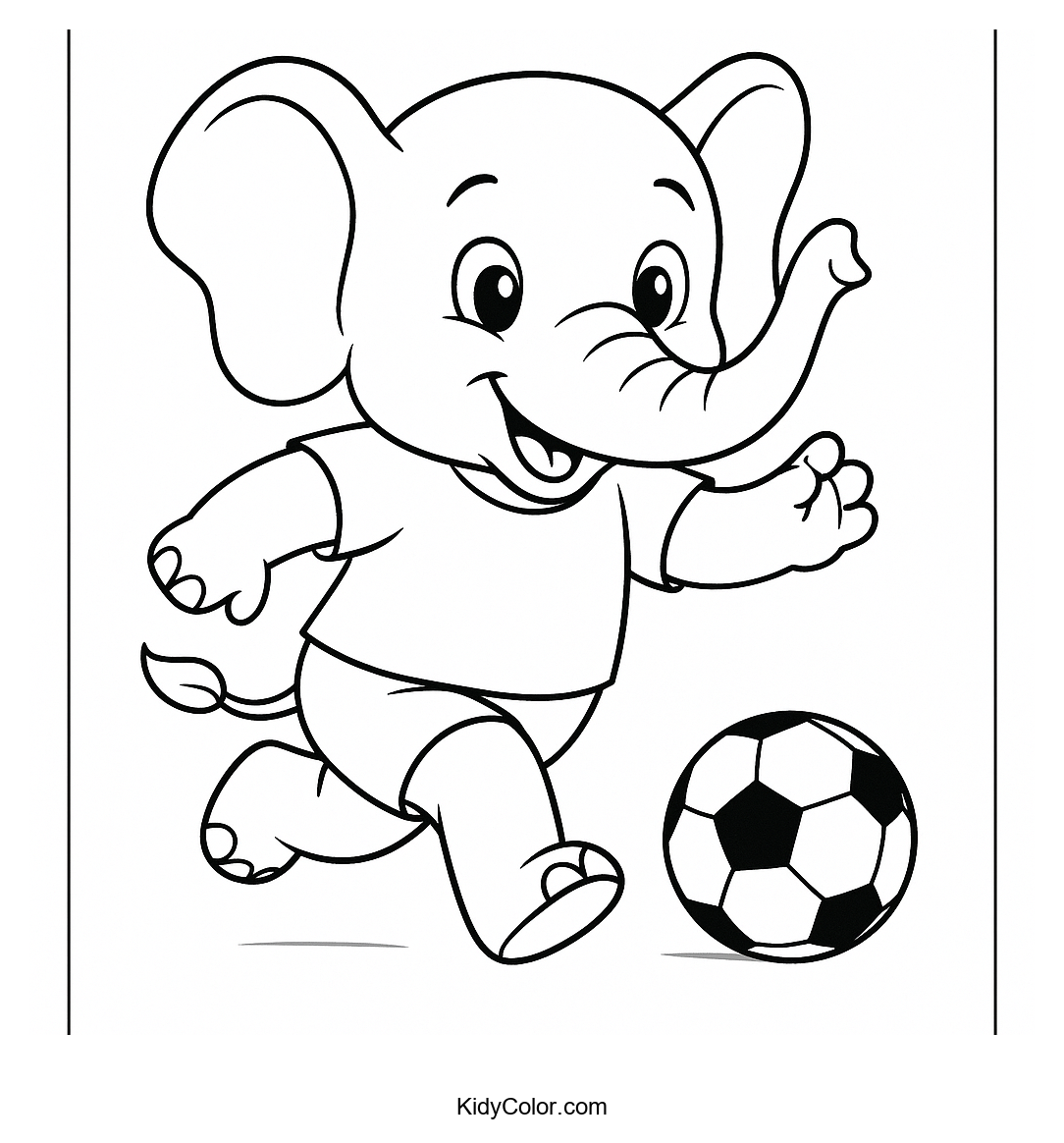 Discover a fun-filled coloring page featuring a cheerful elephant kicking a soccer ball. Perfect for sports-loving kids, this delightful scene encourages creativity as children bring this playful elephant to life with vibrant colors.