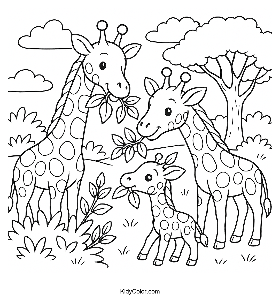 Discover the joy of coloring with our delightful "Cheerful Giraffes in Nature" page. Perfect for young artists, this scene featuring happy giraffes in their natural habitat will spark creativity and provide hours of fun.