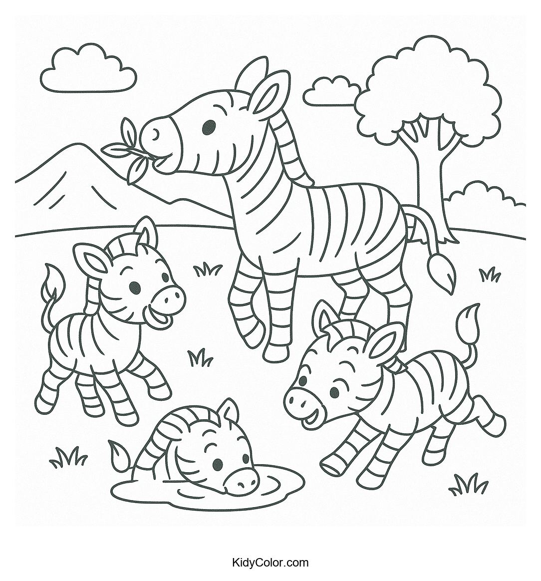Delight your kids with this serene zebra family coloring page featuring zebras relaxing in rolling hills. It's perfect for sparking creativity and imagination while learning about animals and their habitats.