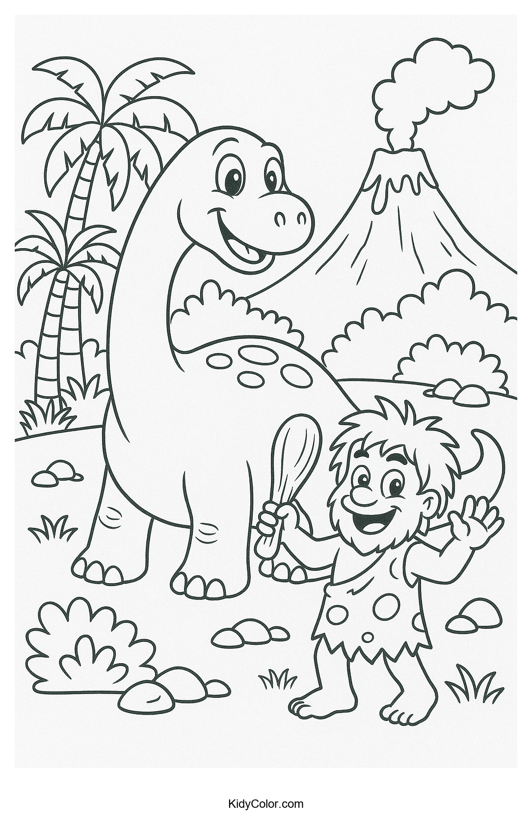 This delightful coloring page showcases a fun and adventurous scene of a caveman and his dinosaur buddy. Perfect for sparking imagination and creativity, kids will enjoy bringing this prehistoric friendship to life with their favorite colors.