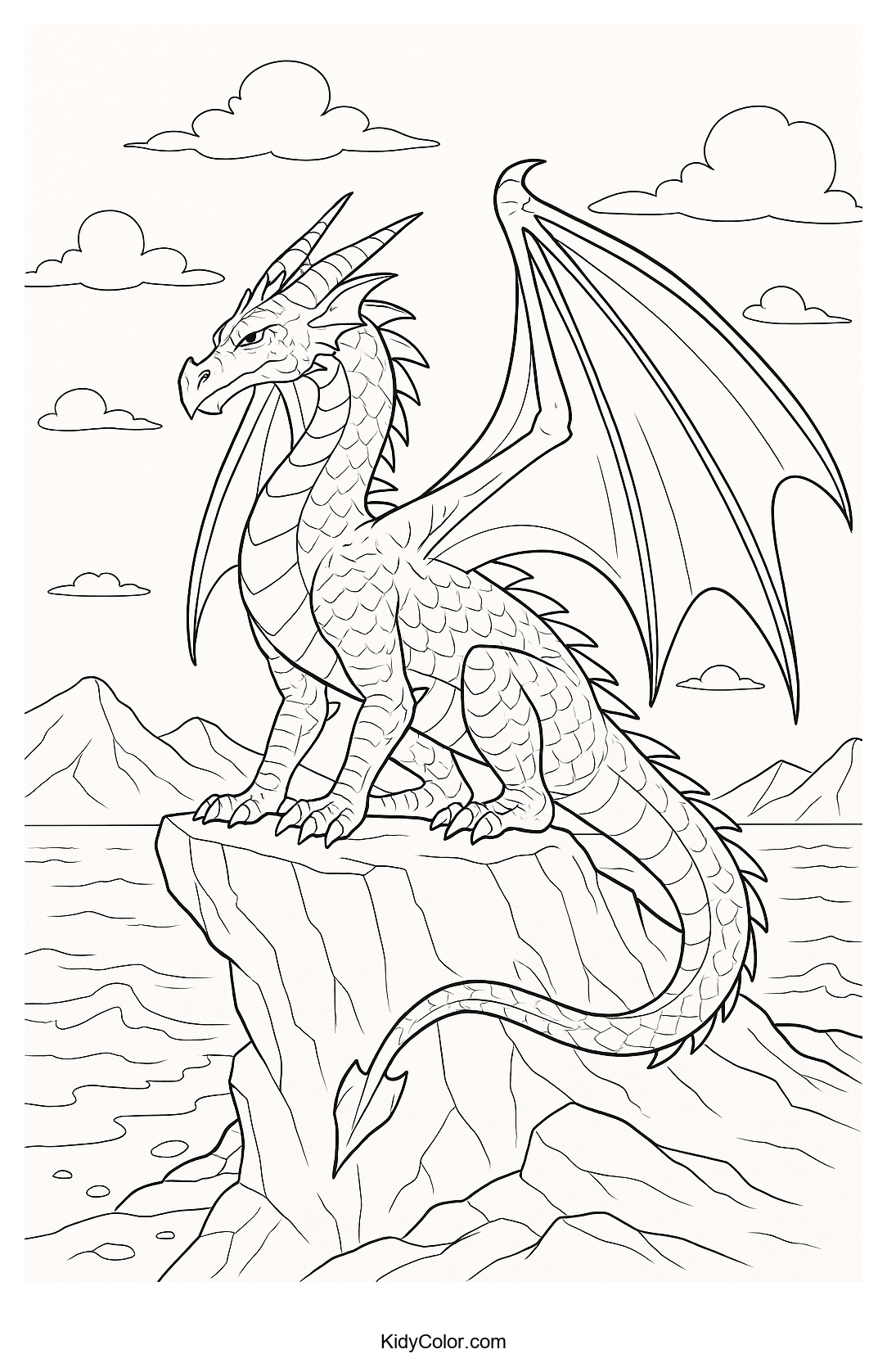Explore fantasy worlds with this dragon coloring page, featuring a majestic dragon perched on a rocky cliff. Perfect for adventurous kids who love mythical creatures, this page promises hours of creative fun with endless color possibilities.